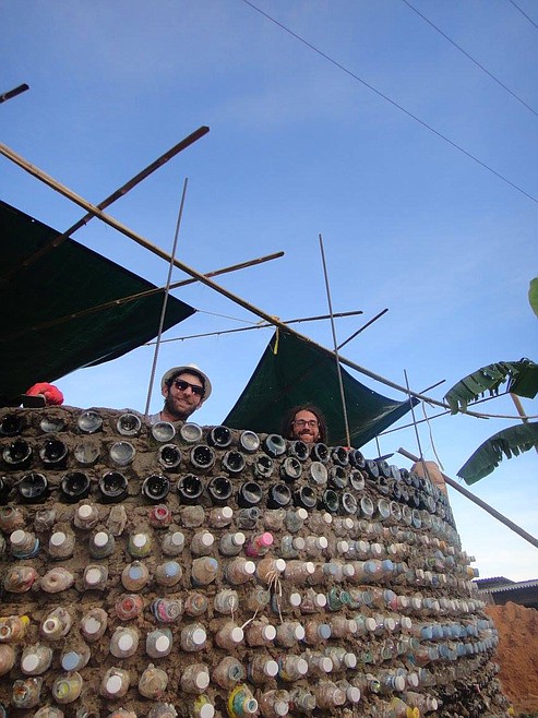 Red Road Foundation volunteers help build a wall using recycled plastic and glass bottles in rural Cambodia. (Photo courtesy Red Road Foundation)