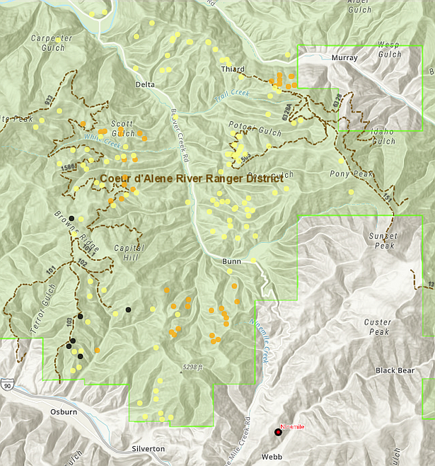 Prichard/ Murray location: Area north of FS road 151 and south of Kings Pass road near Duncan Gulch.
