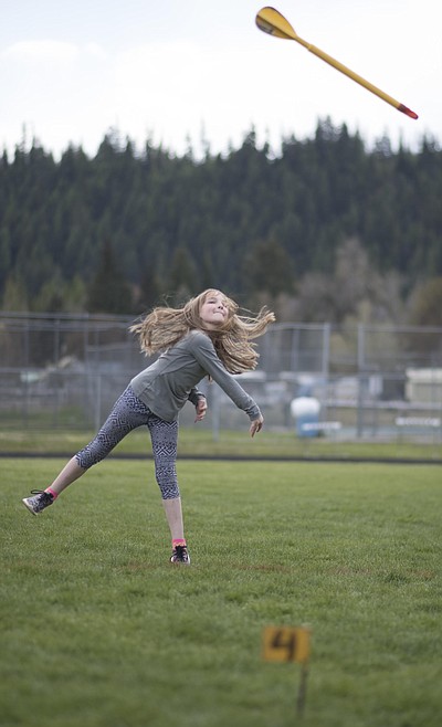 Tessa Purdy tests her throwing arm on the track during the 4th and 5th grade Mini Meet, Thursday, May 2 at the Libby High School. (Luke Hollister/The Western News)