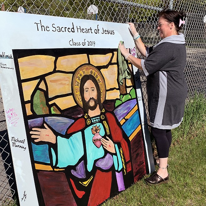 Art teacher Jennifer Griffith wipes away soot from a painting created by eighth-graders at St. Matthew’s School depicting one of the church’s stained glass windows. The painting had been stored in the basement. (Hilary Matheson/Daily Inter Lake)