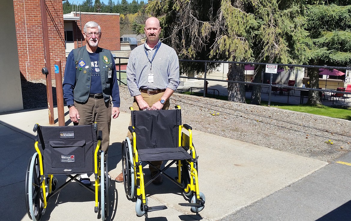 Newport Hospital and Health Services Rehabilitation Manager, Michael Zeimantz, right, accepts a donation of two brand new wheelchairs from the Pend Oreille County Knights of Columbus. In 2003, the Knights of Columbus began participating in the Global Wheelchair Mission and has since sponsored the delivery of nearly 60,000 wheelchairs throughout the world. Tom Garrett, pictured left, a member of the Pend Oreille County Knights of Columbus, delivered the gift.