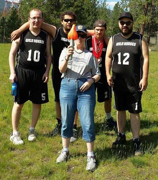 Several Special Olympians and their families met the entire entourage as they entered Thompson Falls, with Justin Knudsen taking the first handoff. As he tired, his buddy Sean McMahon took the torch on into town, followed by a merry band of volunteers.