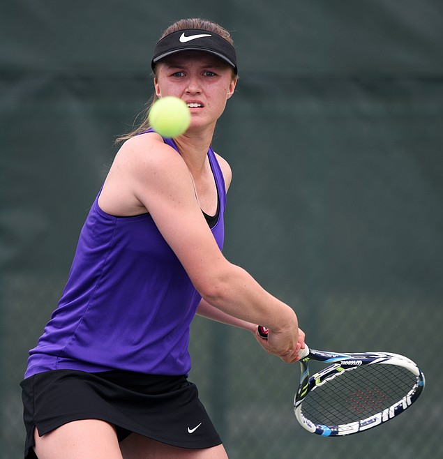 Columbia Falls' Hannah Schweikert hits a return against Polson's Sarah Kinzle in the Northwestern A Divisionals at Flathead Valley Community College on Thursday. (Casey Kreider/Daily Inter Lake)