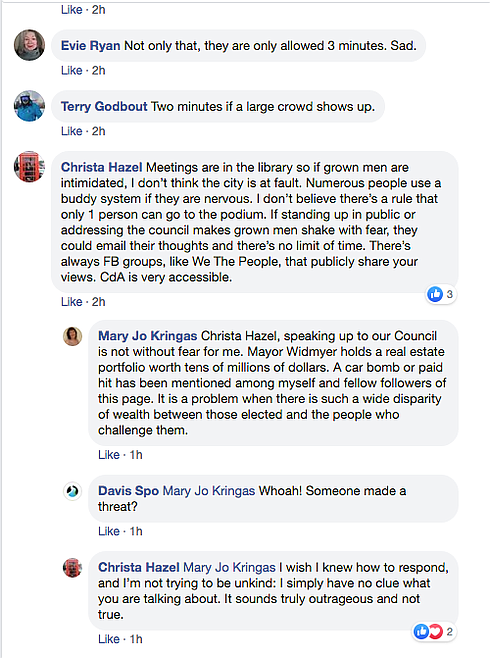 Before that, a dialogue arose among visitors to the online group about their experiences in various public meetings. Coeur d’Alene resident Mary Jo Kringas wrote the following post: