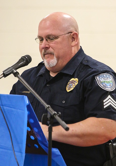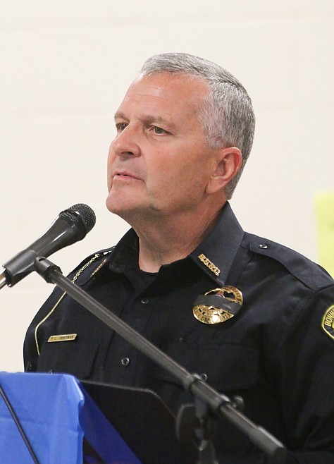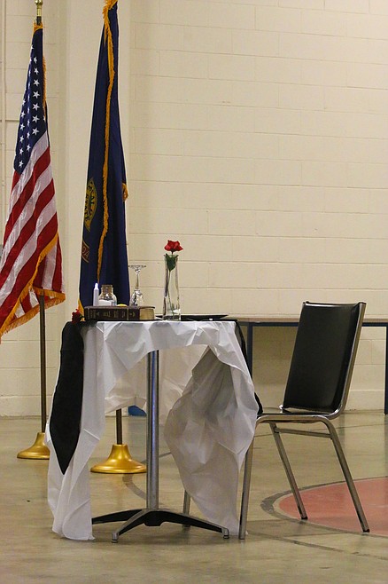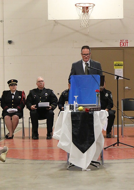 Bonners Ferry Police Chief Brian Zimmerman spoke about “Gone, but not Forgotten,” then Boundary County Sheriff Dave Kramer explained the symbolism of the empty table set up before the podium.