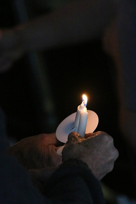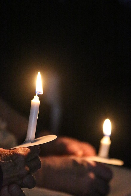 The lights were then lowered as the audience, seated or standing around the edges of the room, passed a flame from candle to candle, and the reading of names began.