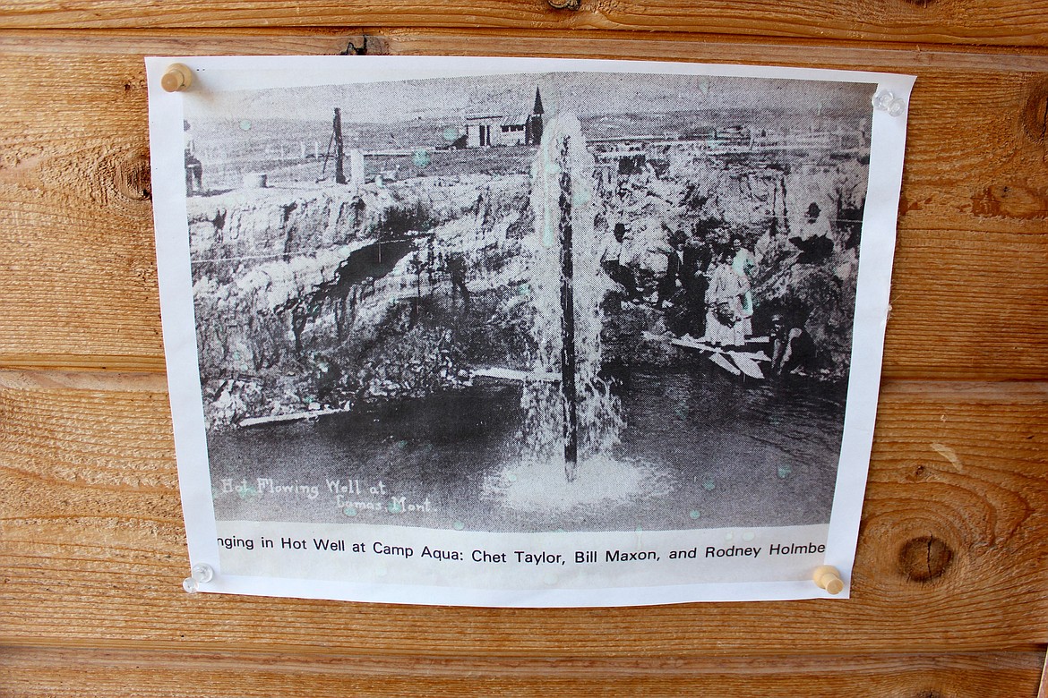 The stream created a deep pool in the earth. Trough-like structures were placed into the sides of the new hole - barely immersed below the water line - allowing people the opportunity to soak after they combined the 128-degree water with chilled water from a nearby barrel. The natural pool no longer exists, but a photo of it hangs on the wall at Wild Horse.