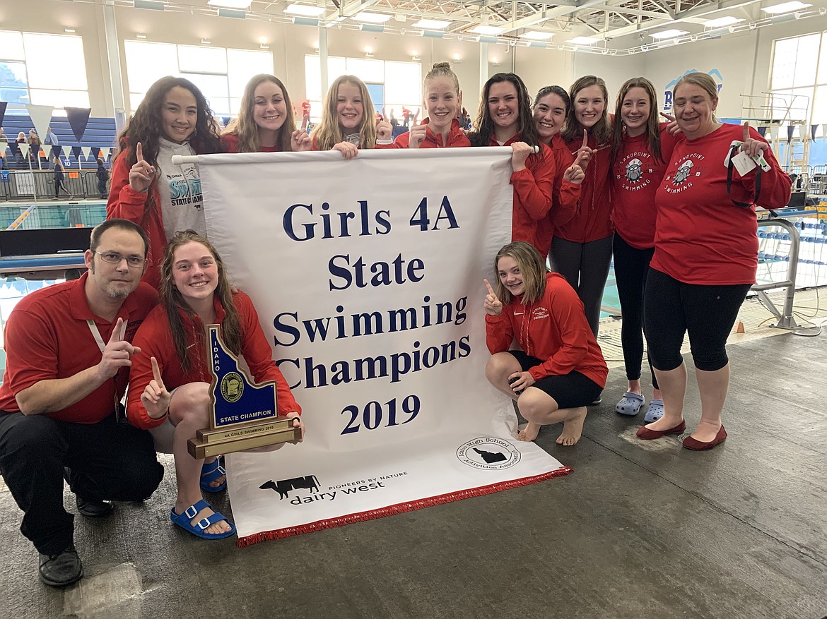 The girls won the 200 medley and 400 free relays and took second in the 200 free relay to help propel them to the victory while senior Mikayla Schoening defended her individual state title in the 100 free with a meet record time of 54.66.