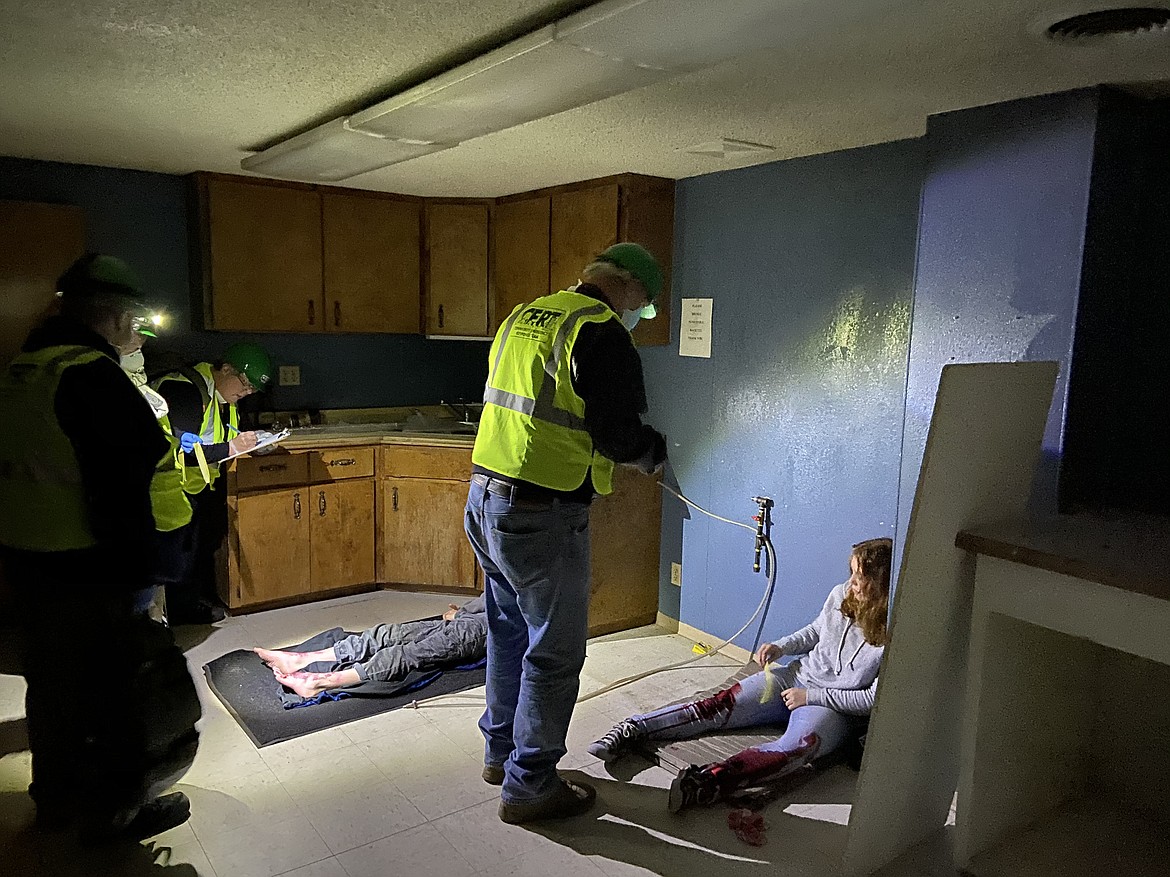There are four stations during the mock disaster to simulate the four different aspects taught during the classroom training: a cribbing station, where the volunteers use tools or other means to lift something from a person trapped underneath; a fire station, where volunteers safely put out a fire; search and rescue, where victims are safely located and extricated from a situation; and a treatment area, which those “hurt” in the disaster receive care and are triaged based on what systems they are portraying.