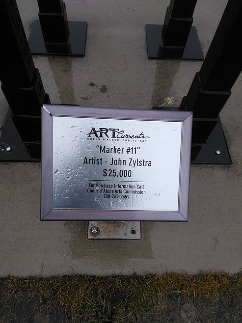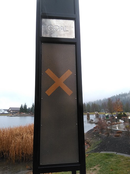 Marker #11 was a piece of art chosen by the Coeur d’Alene Arts Commission as part of its artCurrents program, a series of sculptures and creations that rotate through the community. Its creator, artist John Zylstra, built a box-like structure featuring the word “COAL” on each side, beneath a representative symbol from the language’s native country. The word “COAL” in English hovers over the American street sign for a railroad crossing, a giant red X.