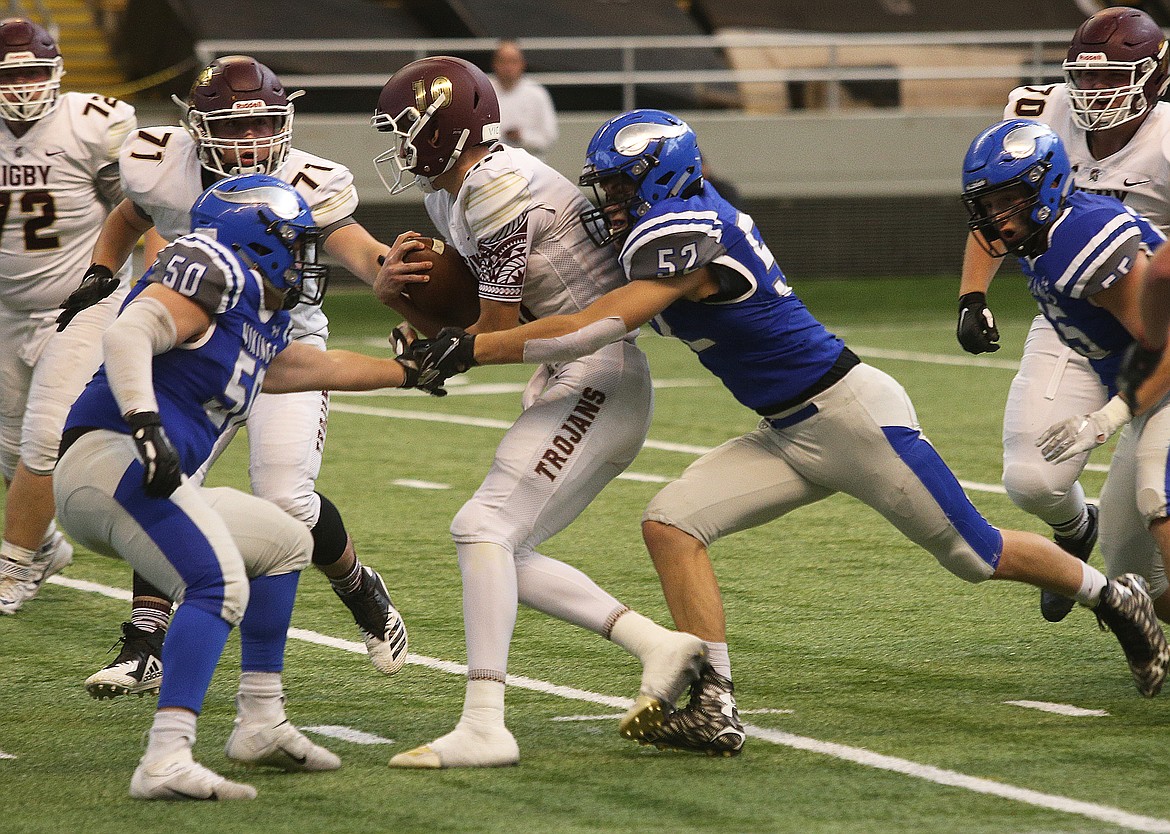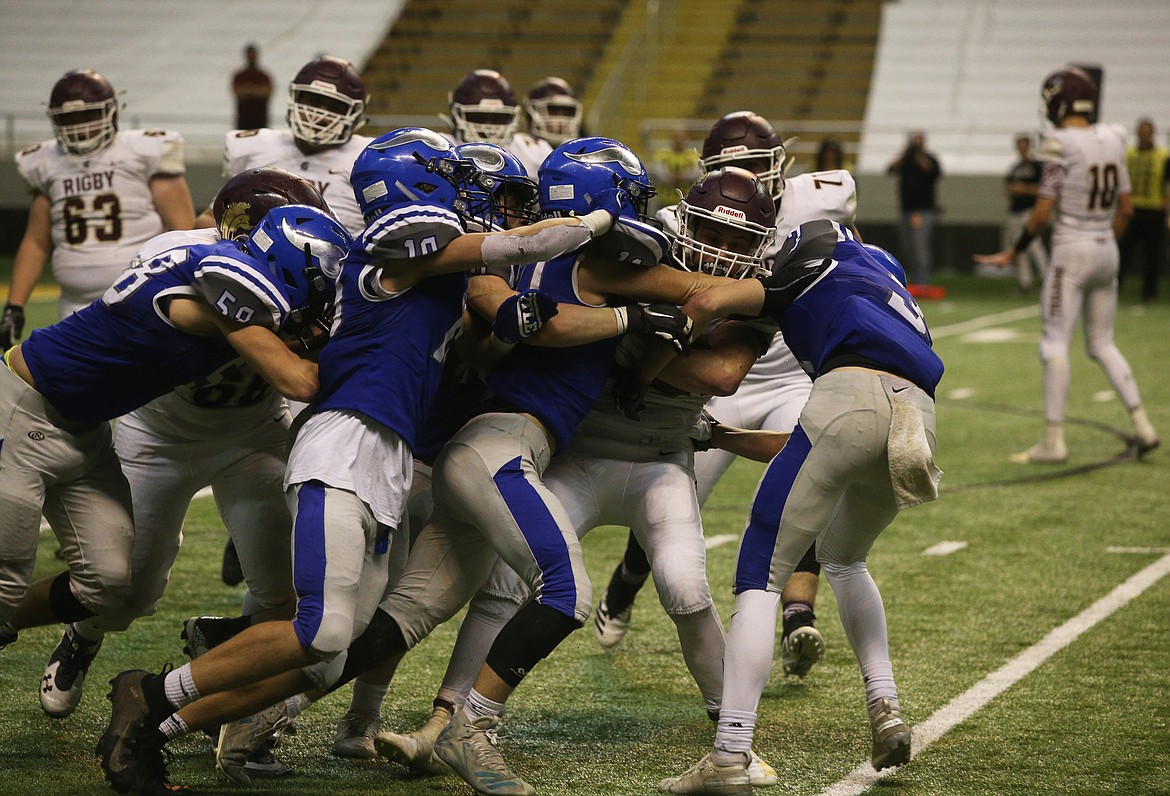 But Brigham Youngstrom of Rigby crashed over the left side and just across the goal line for a two-point conversion for the winning points in double overtime — a gutsy call by the Trojans — lifting Rigby to a wild 57-56 victory over Coeur d’Alene in a remarkable, draining title game Saturday afternoon before an estimated 5,000 at the Kibbie Dome.