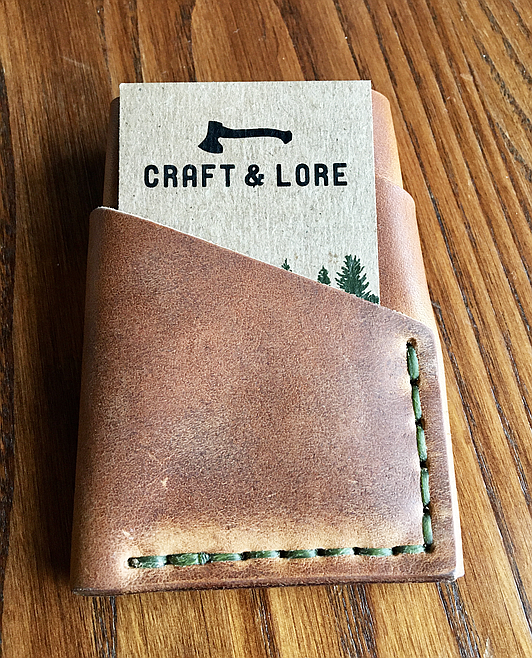 One more thought pops into my mind as I begin to walk back to the showroom. I mention to Mike that my dad wants to buy a wallet and asked if I could buy one while there. With a smile, Mike motions me over to a wooden bin labeled “Odds and Ends.” He ruffles through the discarded leather for a few seconds until he draws out an oddly cut piece of leather. It looks brand new except for about 40 evenly spaced stitching pin holes. He effortlessly folds the leather scrap into a “port” wallet, a custom design of Craft and Lore. He creases and folds it like origami paper. He then gifts me the wallet, free of charge, for my dad.