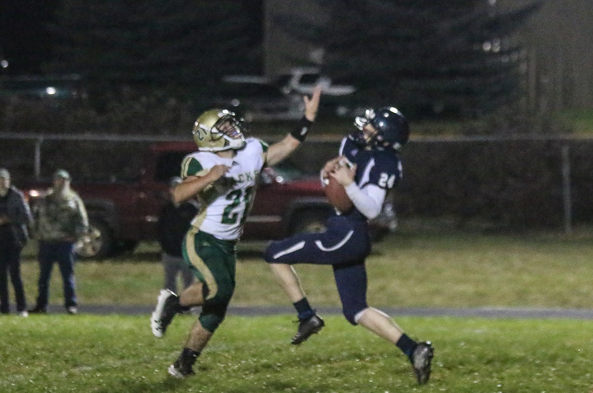 St. Maries’ junior quarterback, Eli Gibson, marched his team down the field and he punched in a 5 yard touchdown run just before the half. Gibson also ran a quarterback keeper into the end zone for the two-point conversion, making the score 14 all at halftime.