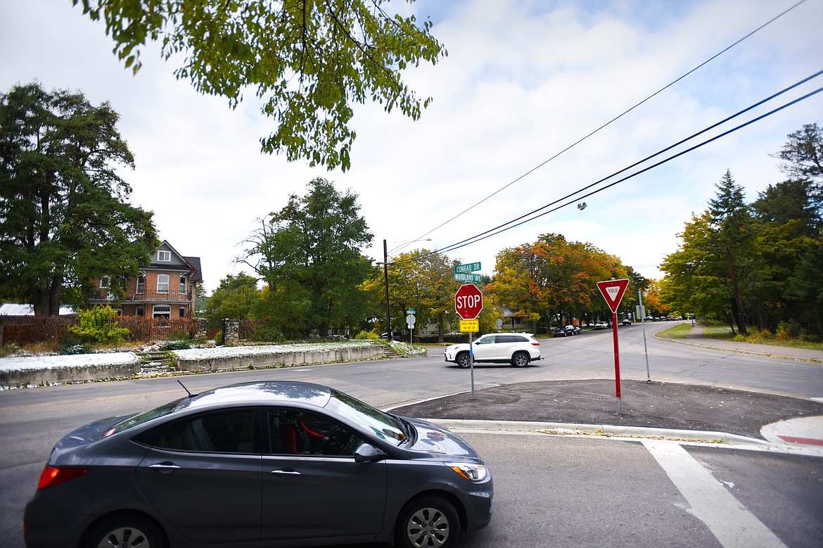 The mini-roundabout option was identified through an early feasibility study as the best improvement to address the tricky intersection near the southwest corner of Woodland Park. According to the press release, the study identified the “mini-roundabout” as “the most appropriate intersection control” option.