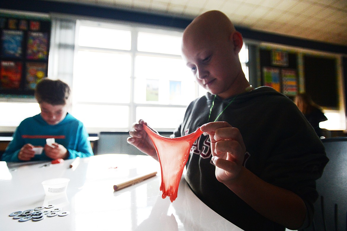 Across the way, fifth-graders Ty Mckinzie and RJ Anthony stretched their slime and dropped washers in it. Then, they rolled it out and wrapped it around a film canister. Their idea — using the slime as a packing material in outer space.