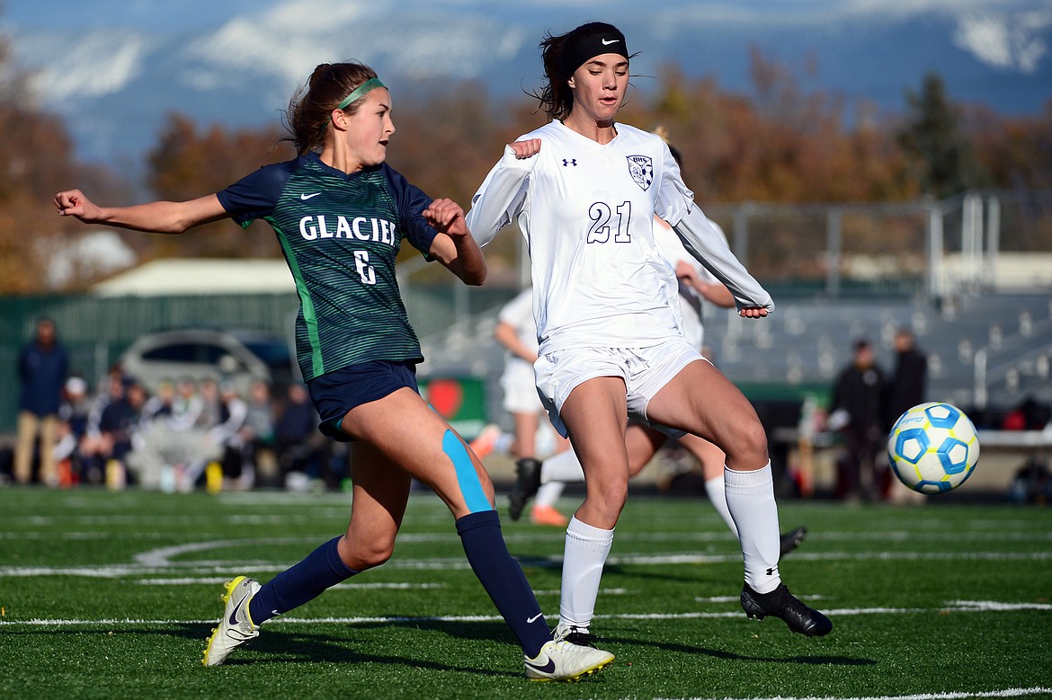 Glacier's Madison Becker (18) battles Butte's Brie Birkenbuel (22) for possession at Legends Stadium on Tuesday. (Casey Kreider/Daily Inter Lake)