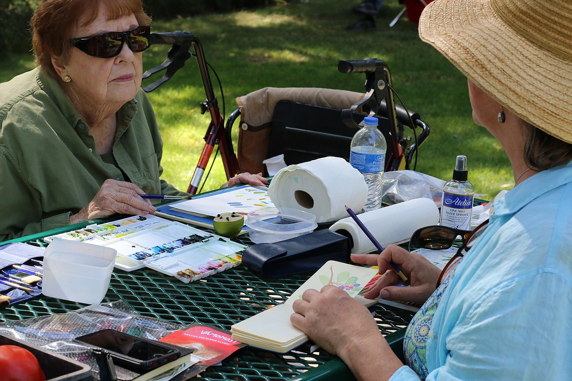 Not far from Bleile, Debbie Aaron and Wendy McClintock were set up at a picnic bench. McClintock was surrounded by palates of watercolor paints.