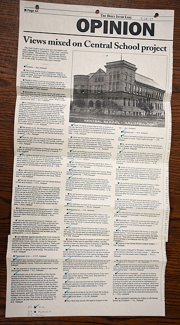A three-ring binder contains all of the articles and opinions that were stirred up in March of 1997 as Kalispell debated the decision to save the historic Central School or not. In that binder is this copy of an opinion page from the Daily Inter Lake that ran on March 28, 1997. The museum staff counted the opinions for and against and came out to 27 for (marked with a blue check) and 26 against, showing how evenly divided the residents were on this issue.(Brenda Ahearn/Daily Inter Lake)