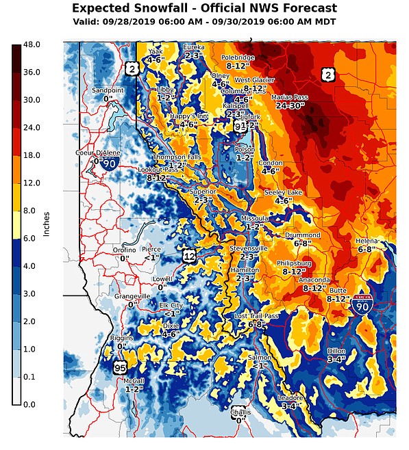 Snow totals in Polson could be in the 3-4 inches range, Bigfork 2-3 inches, Kalispelll 1-2 inches, Columbia Falls 2-3 inches, Libby 1-2 inches and West Glacier 4-6 inches.