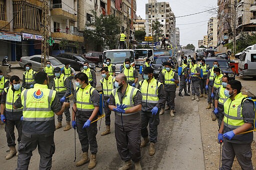 During a tour for journalists in Dahiyeh, the densely-populated southern Beirut suburb that is Hezbollah's stronghold, members of the group's civil defense department, wearing uniforms, masks and gloves, sprayed streets. Volunteers delivered boxes of food to low-income residents.