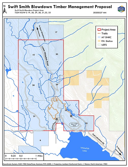 According to the DNRC proposal, the primary objectives of the Swift Smith project are to salvage and capture the value of the blown down and damaged timber, and reopen roads, trails and areas for recreation such as the Swift Creek portion of the Whitefish Trail and the Smith Lake Disc Golf Course.