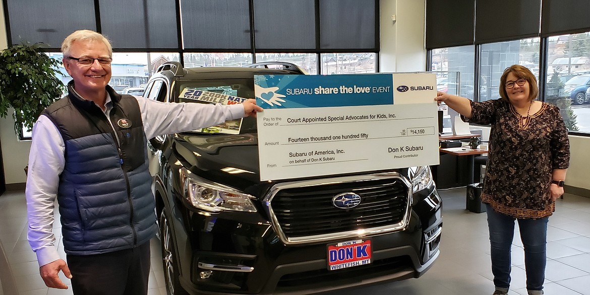 Don “K” and Subaru recently presented a check for more than $14,000 to the Flathead Valley’s Court Appointed Special Advocates (CASA for Kids) as a result of their being chosen by the employees at the dealership as the 2019 hometown charity beneficiary of the recently completed Subaru Share the Love event.