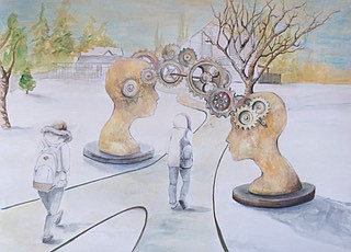 The sculpture would be located along the walking path between the high school and the Center for Sustainability and Entrepreneurship, and features two unisex human heads on either side of the path, connected overhead by metal gears.