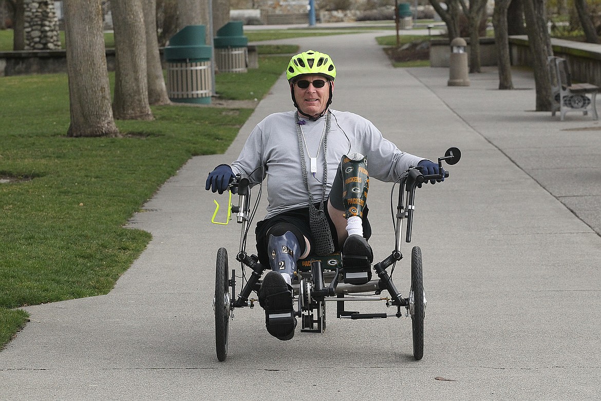 The green, gold and white of Wisconsin’s favorite football team are visible as he pedals his recumbent bike on these beautiful sunny days that he loves.