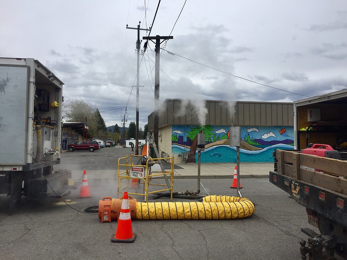 Steam billowed from a manhole on 12th Street in Coeur d’Alene’s Garden District on a recent rainy afternoon, as the Coeur d’Alene Wastewater Department worked to rehabilitate sewer pipelines.