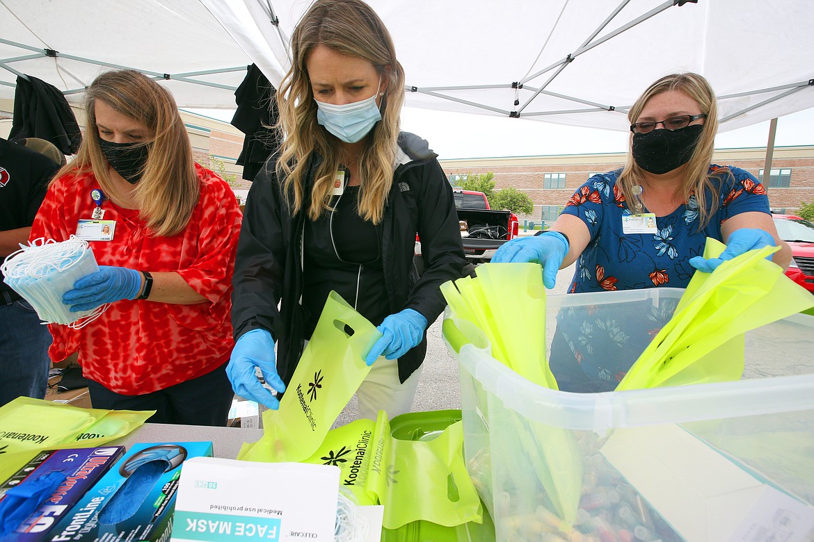 Kootenai Health employees Tolli Willhite, Katrina Walker and Angela Gordon formed a line as they prepared bags, which also contained sunscreen, lip balm and fire department stickers and pencils.