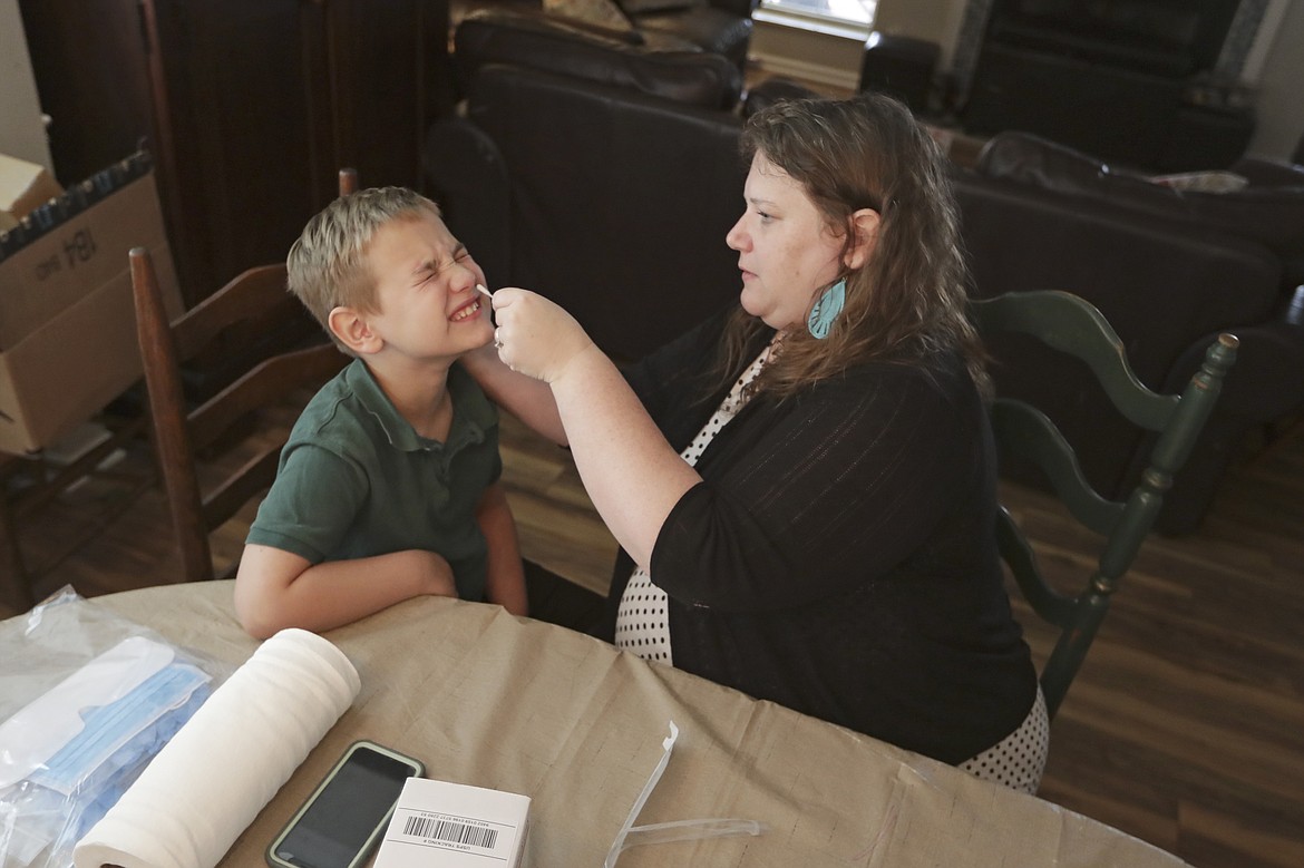 For Mendy and Joe McNulty and their two youngest sons in Mt. Juliet, Tennessee, nasal swabbing at home is a family affair. Testing supplies are spread out on a carefully wiped down kitchen counter, where the four gather to perform what has become a ritual. Mendy McNulty helps the boys with their swabbing.
