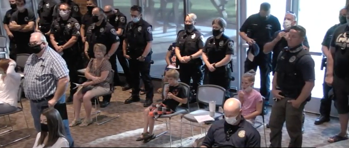 “If you look behind me, you’ll see a sea of blue,” Kevin Crayton of Post Falls said before pointing to the back of the library’s community room, where a line of Coeur d’Alene police officers stood in solidarity. “And some of you are probably wondering why these guys are here. That’s because they have a leader that has brought this department more than any leader has in the 20 years I’ve been a resident of this community. These guys are here because they believe in what they do, and they stand with their chief, and they’re making a statement to all of you guys.”