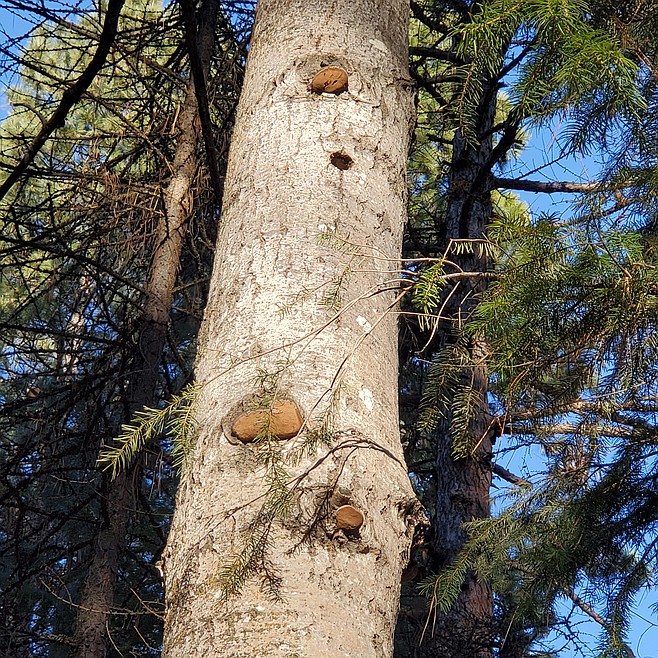 On a recent hike in Boundary County, I saw several conks overhead in a White Alder tree growing on the trunk, a sure sign the alder is decaying from the inside out. Conks, also known as shelf fungi or bracket fungi, are an external indicator that a tree may be rotting inside.