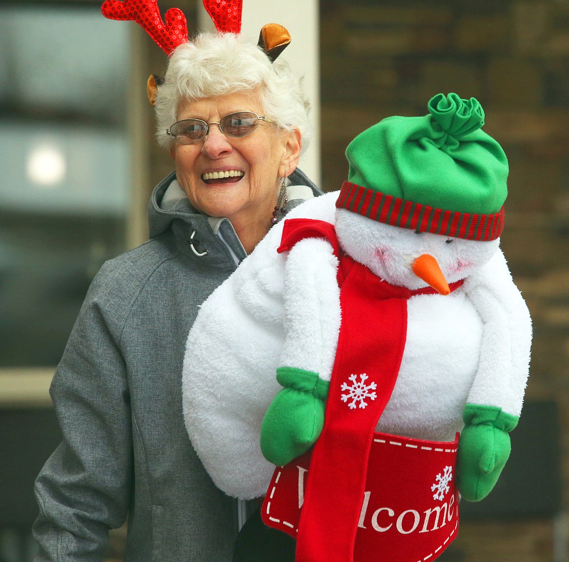 Dianne Dickinson, wearing red antlers, retreated inside briefly and returned with a fluffy snowman. She was happy.