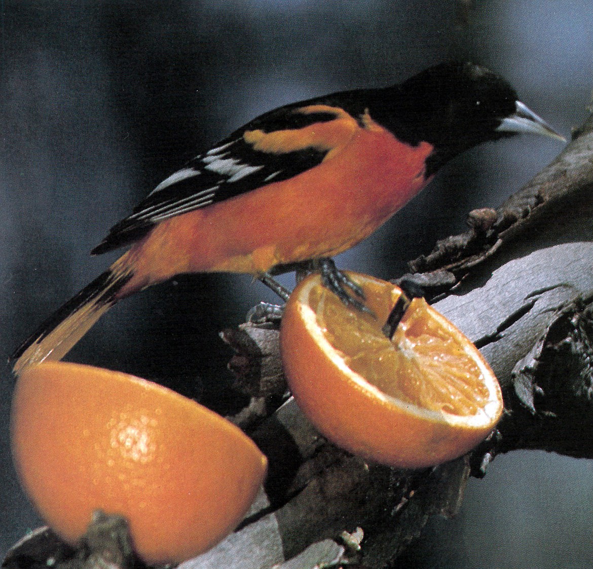 Trust of the wild creatures is the most precious gift of all. Especially welcome are the varied thrushes which show up occasionally at the “broadcast” site. Looking somewhat like a robin all dressed up for a party, these big beauties aren’t too often seen, but their lovely, mournful one-note call and the mate’s answer are heard frequently in the woods. A similar beauty — also seen occasionally, is the Bullock’s (or Northern) Oriole — the western relation of the Baltimore Oriole — its orange tone is similar to the Varied Thrushes and robins and from a distance a quick sighting can often confuse any of the three for one another. By the way, Orioles — as per our illustration — are fruit lovers, so cut up an orange to add to your seed offerings.