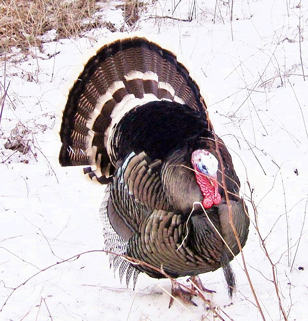 The (once) little muley fawn who was born in the woods behind my home very early last spring, is now a handsome — though still only half-grown — young buck sporting a tiny pair of new antlers, who waits for the handout of a carrot nearly every day. He lost his mother early — probably one of the many yearly victims of Schweitzer’s traffic — and grew up where she had left him — trusting me (there’s that word again!) and often joining the throngs of turkeys that come each morning at 6 a.m. I’m there with a bucket of sunflower seeds to broadcast for their morning repast as well as with his carrot.