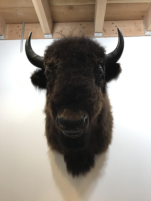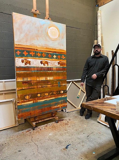 You can’t miss it: the giant bison head looming out of the wall in local oil painter Jeff Weir’s art studio at the Rockford Building in downtown Coeur d’Alene. The taxidermy, one of several unique features to this artist space, was a trade for one of Weir’s paintings. Artisan wood carved furniture, large canvases stacked up against the walls, and various tools found about the room give the studio both the sense of a workspace and an environment to sit and visit with Jeff. The 6’4” bearded painter picks up a piece of paper spotted with mixed brush strokes captioned with detailed cursive instructions.