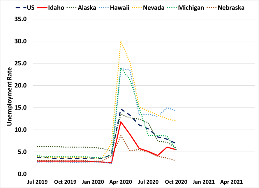 Wolkenhauer pointed out that some states that had no stay-home orders during the spring, such as Iowa and South Dakota, have not bounced back like Idaho. This suggests that lockdown measures were not the leading factor in economic recovery.