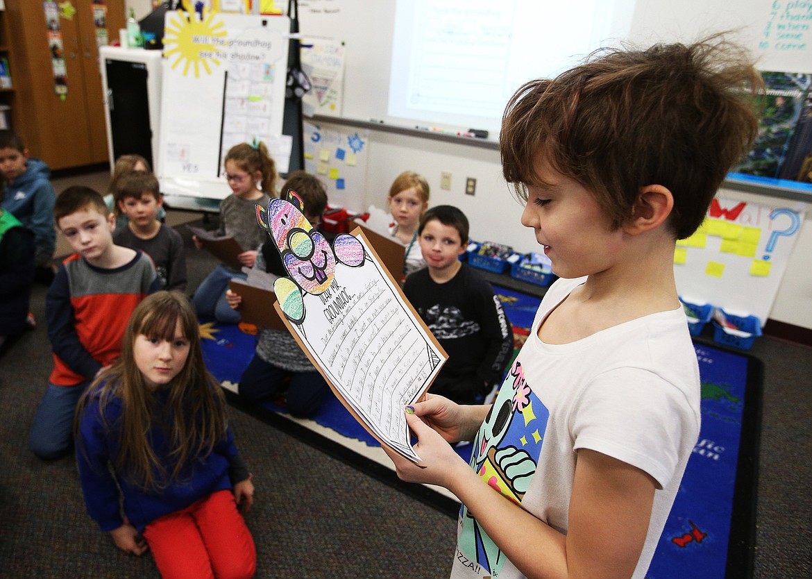 "Dear Mr. Groundhog, I want an early spring because my sister’s birthday is in spring," second-grader Roslyn Vreeken said, reading Friday from her worksheet, which included a rainbow-colored groundhog.