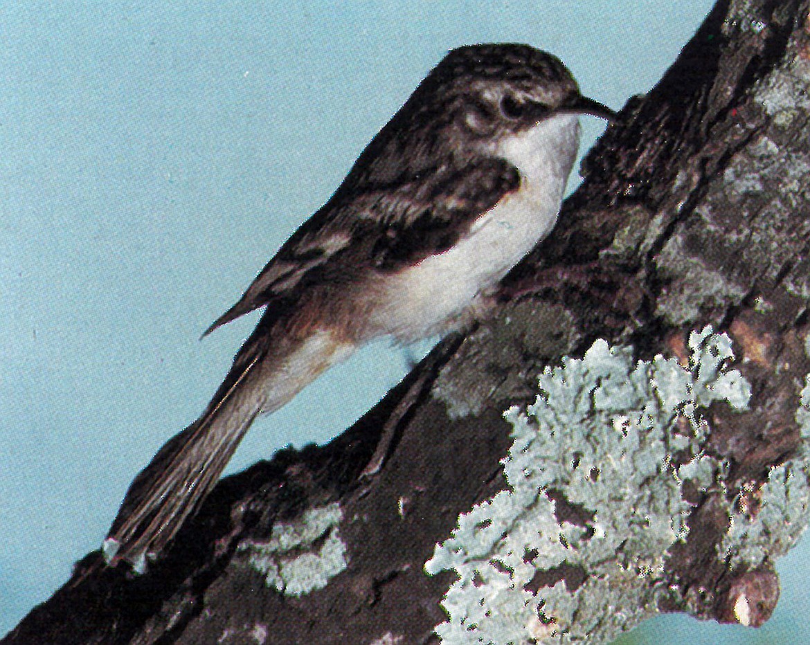 Chris’s call not only delighted me, but put me on watch for my own resident birds. I got to thinking about one of my favorites, the Brown Creeper — a small, perky, Chickadee-sized bird — which has always been a part of my winter visitors. I had looked for them a few times and had no luck. They’re hard to find, since they live in and on their trees, nesting high in the uppermost branches. They live on the food they find under the bark, which they locate in the most cunning way. They flutter down to the bottom of the tree and begin a circular search of the bark, probing with their curved, sharp little beaks. They work their way upward — never sideways or downward (as per the nuthatches) — then fly to the bottom and start over again. Their mottled brown/grey feathers match the bark of their tree, so when they’re moving upward they are very difficult to see.