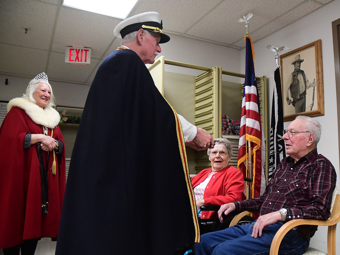 The royalty from Whitefish Winter Carnival traveled to the Montana Veterans’ Home in Columbia Falls last week to honor Bob and Dorothy Croucher, two of the home’s residents, with a special title. King “Ullr” Scotty MacLaren dubbed the couple, who met at the age of 75 playing pinochle, the “Card-Carrying Crouchers,” complete with a model sword. Queen Gayle MacLaren presented them with pinned sashes.