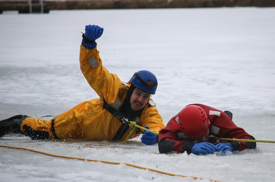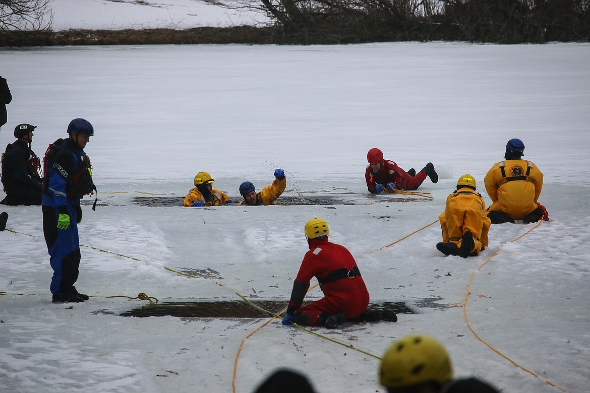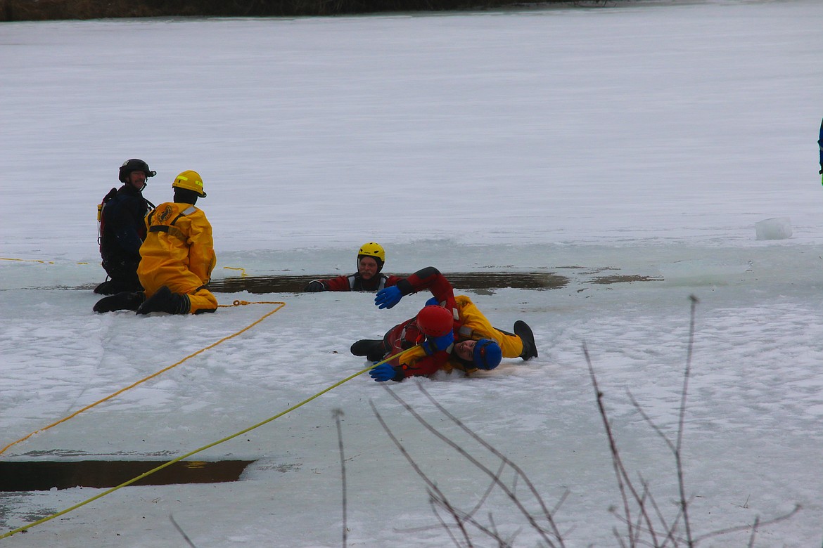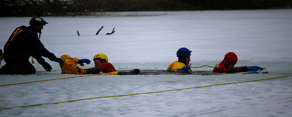 The instructors were South Boundary Fire Chief Tony Rohrwasser and Hauser Lake Fire Captain Gary Mobbs, who is also a member of the Kootenai County Sheriff’s Office Dive Rescue Team, and has been teaching ice rescue training for 16 years.