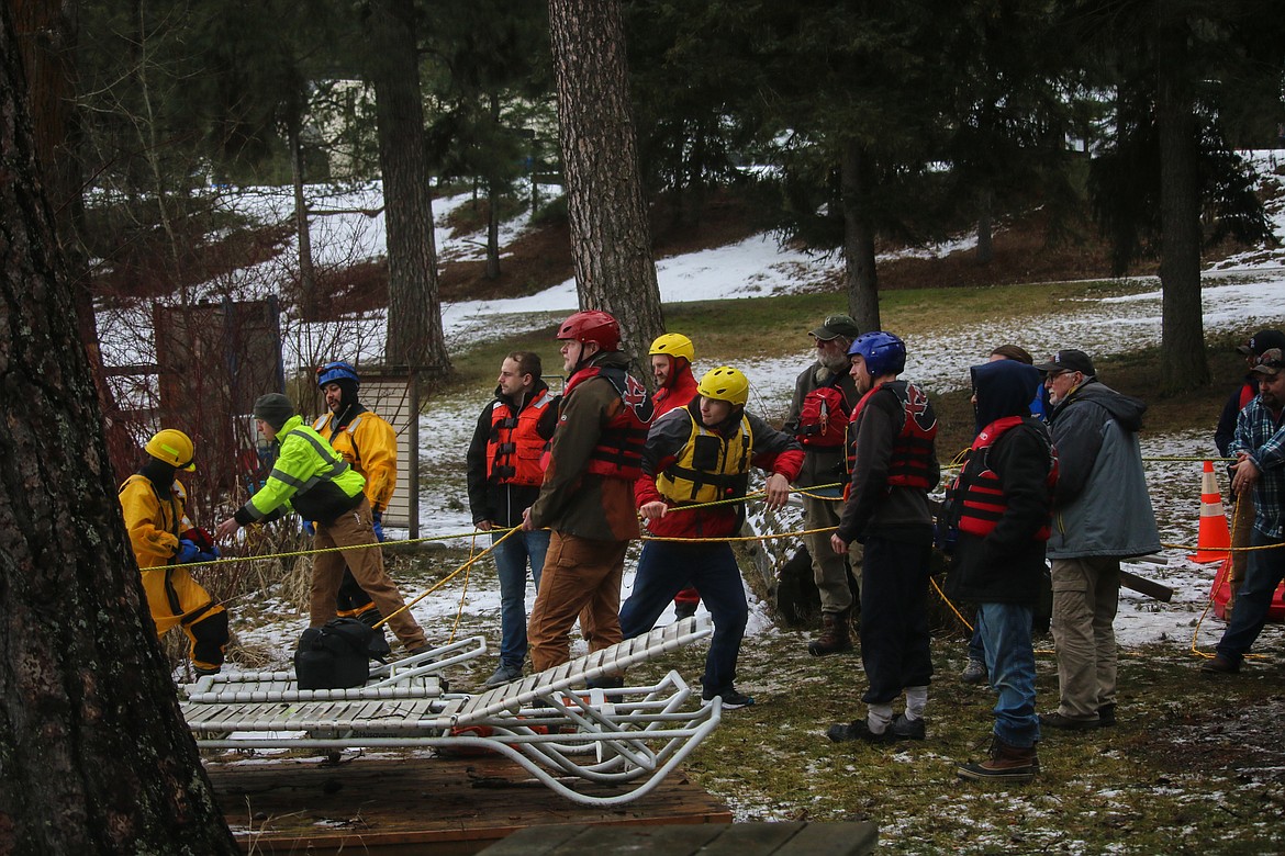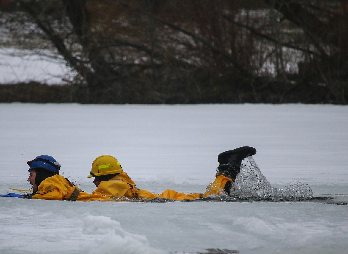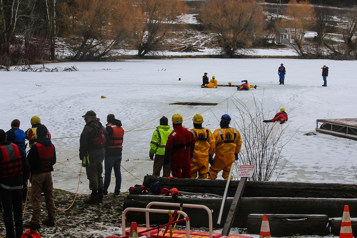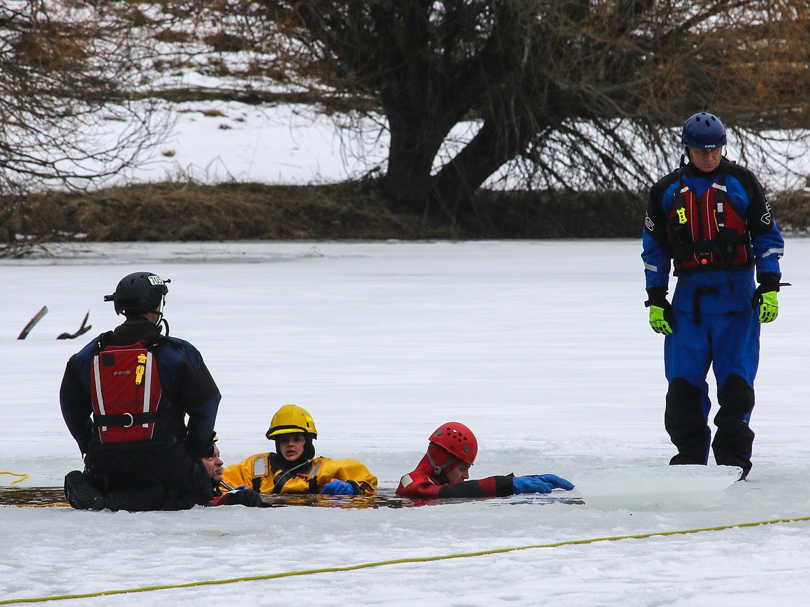 The instructors were South Boundary Fire Chief Tony Rohrwasser and Hauser Lake Fire Captain Gary Mobbs, who is also a member of the Kootenai County Sheriff’s Office Dive Rescue Team, and has been teaching ice rescue training for 16 years.
