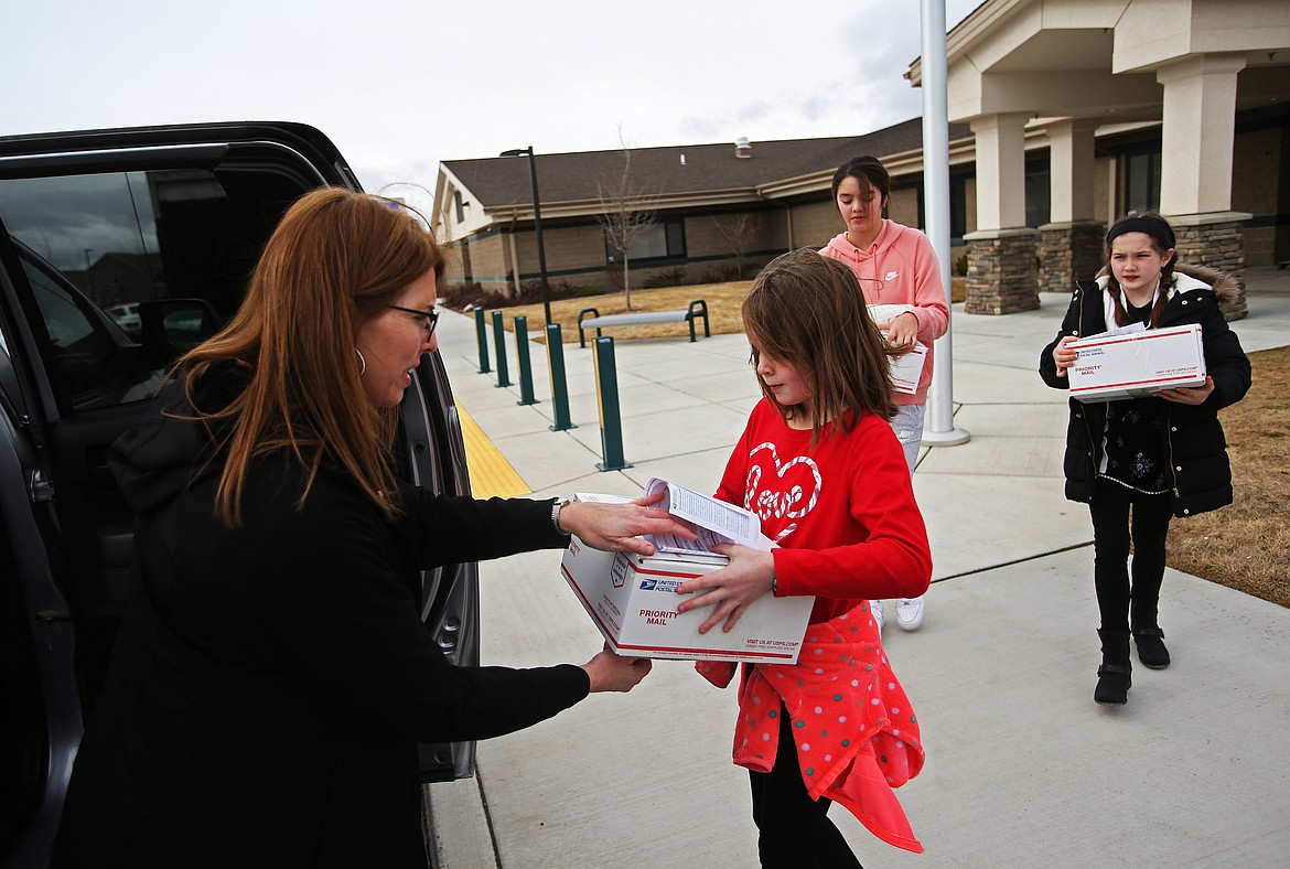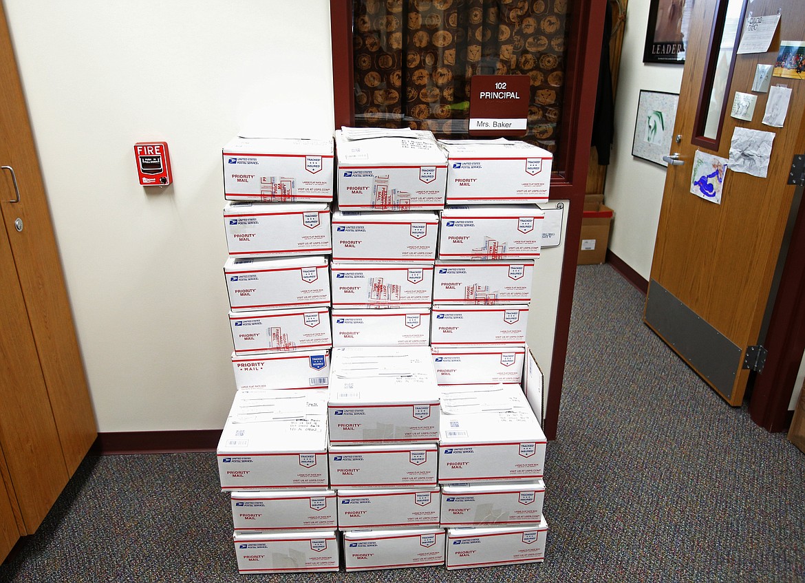 A parade of fifth-graders helped Baker move the boxes from the school office to a truck for delivery to the post office. Haldon Thompson made several trips to help out.