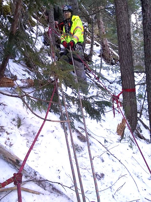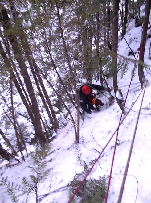 EASTPORT — While firefighters have been known to climb up trees to rescue cats, this time one had to be lowered down on ropes to rescue a dog on Monday, Feb. 17, up past Copper Falls.