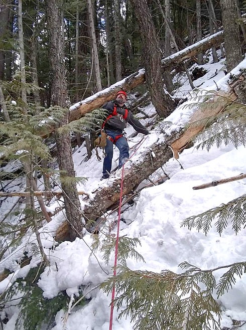 They navigated through snow and ice, fallen trees and underbrush, and crossed Spruce Creek that was full of ice-covered rocks, before tackling about 400 feet of a tree-covered incline of about 60 degrees. For the climb, they were tied to one another, and took turns crawling from one secure location to another utilizing a Prusik Knot to slide along the main line.