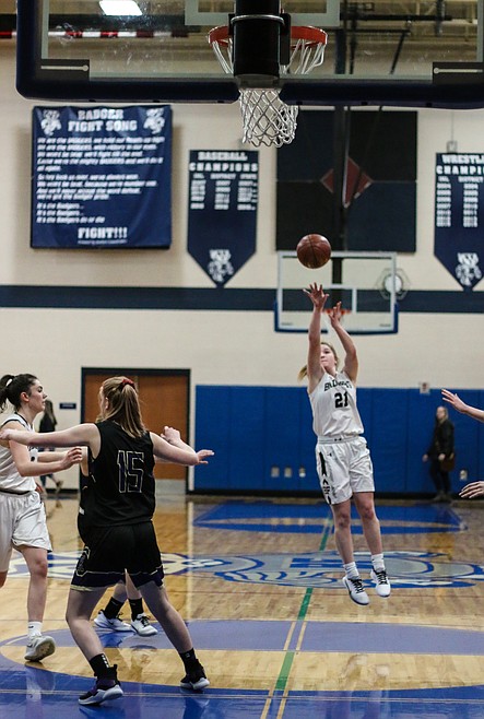 SPIRIT LAKE — After an opening-round loss to Kellogg at districts, the Badgers played Priest River in a loser-out contest. Priest River came out in a stall offense to slow down the Badgers, but after a defensive change, Grace Villelli and Emma Pinkerton got the Badger offense going with some steal/lay-in baskets.