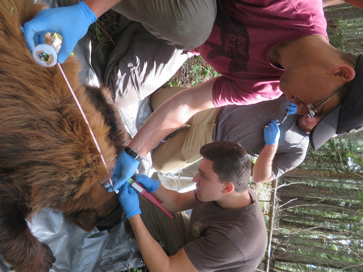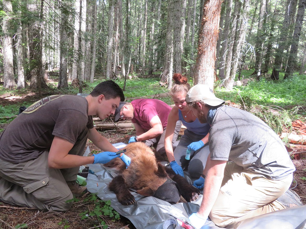 Alerted to the catch, biologists hurry in for a visit to dart and subdue the bear, give it an ear tag and cinch a GPS collar on its neck before releasing it.