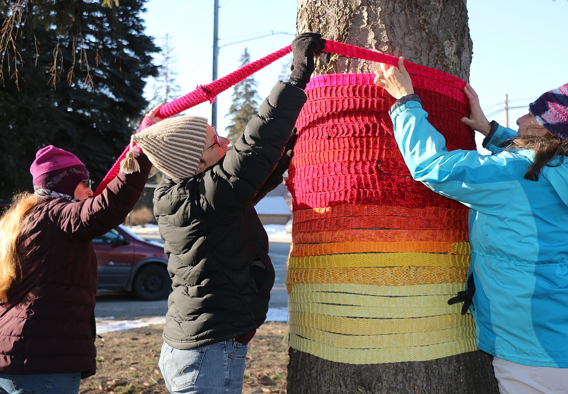 The colorful knitted strips are part of a temporary display of public art — known as “yarn bombing” — on a few of the city’s trees and was done with the city’s permission by a group of local knitters who simply wanted to add a little color to Sandpoint. As such, the city entered into an agreement to allow the colorful, knitted ribbons to be wrapped around the base of the trees, Sandpoint officials said in a press release.