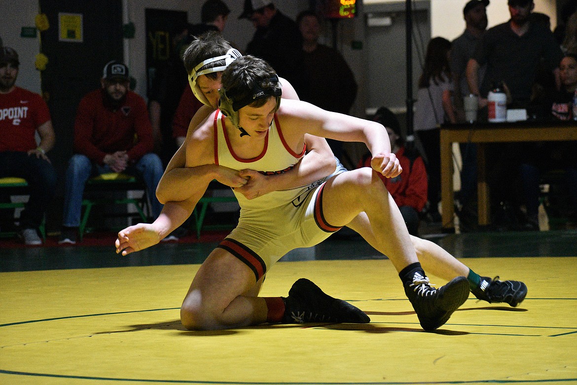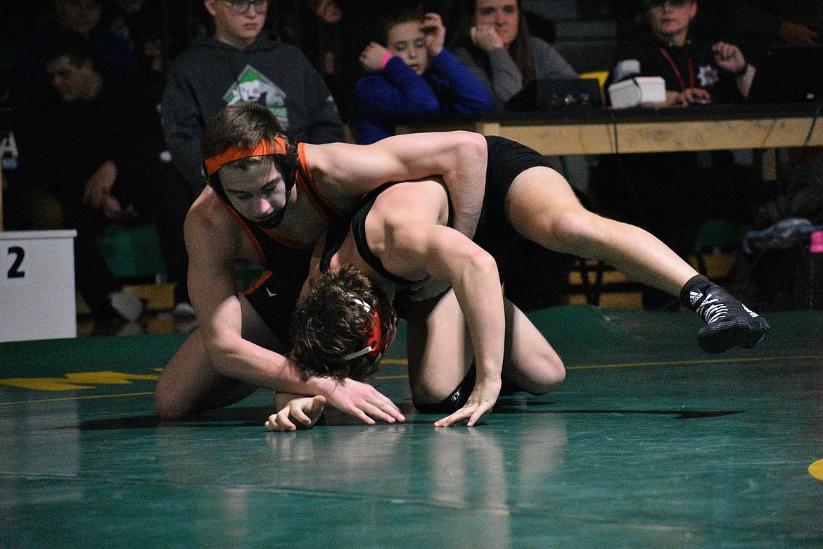 98 — Hayden Sorbel, Priest River, p. Taylor DeFalco, Bonners Ferry, 5:17. 106 — Jake Summerfield, Bonners Ferry, p. Stryker Houston, Timberlake, 5:43. 113 — Dakota Eixenberger, Kellogg, d Wyatt Hei, Kellogg, by forfeit. 120 — Ethan Guy, Kellogg, md. Keith Poirier, Priest River, 10-0. 126 — Evan Barajas, Bonners Ferry, p. Brayden Herbert, Timberlake, 5:36. 132 — Isaiah Evans, Timberlake, p. Spencer Eby, Bonners Ferry, 2:27. 138 — Judson Hall, Kellogg, d. Ethan Jerome, Timberlake, 6-1. 145 — Manuel Naccarato, Bonners Ferry, p. Bryan Durette, Bonners Ferry, 3:50. 152 — Kyle Smith, Bonners Ferry, p. Michael Sentenay, Kellogg, :46. 160 — Caleb Miller, Timberlake, d. Eli Richards, Bonners Ferry, 10-9. 170 — James Bllingsley, Timberlake, p. Austin Stepro, Kellogg, 1:00. 182 — Joey Follini, Timberlake, p. Ryder Paslay, Timberlake, 4:48. 195 — Josh Yanez, Timberlake, p. Andrew Sandelin-Macintosh, Bonners Ferry, 1:15. 220 — Carson Hudson, Kellogg, p. Ray Knerr, Timberlake, 1:10. 285 — Trevor Cady, Timberlake, p. Preston Jeffs, Timberlake, 3:33.